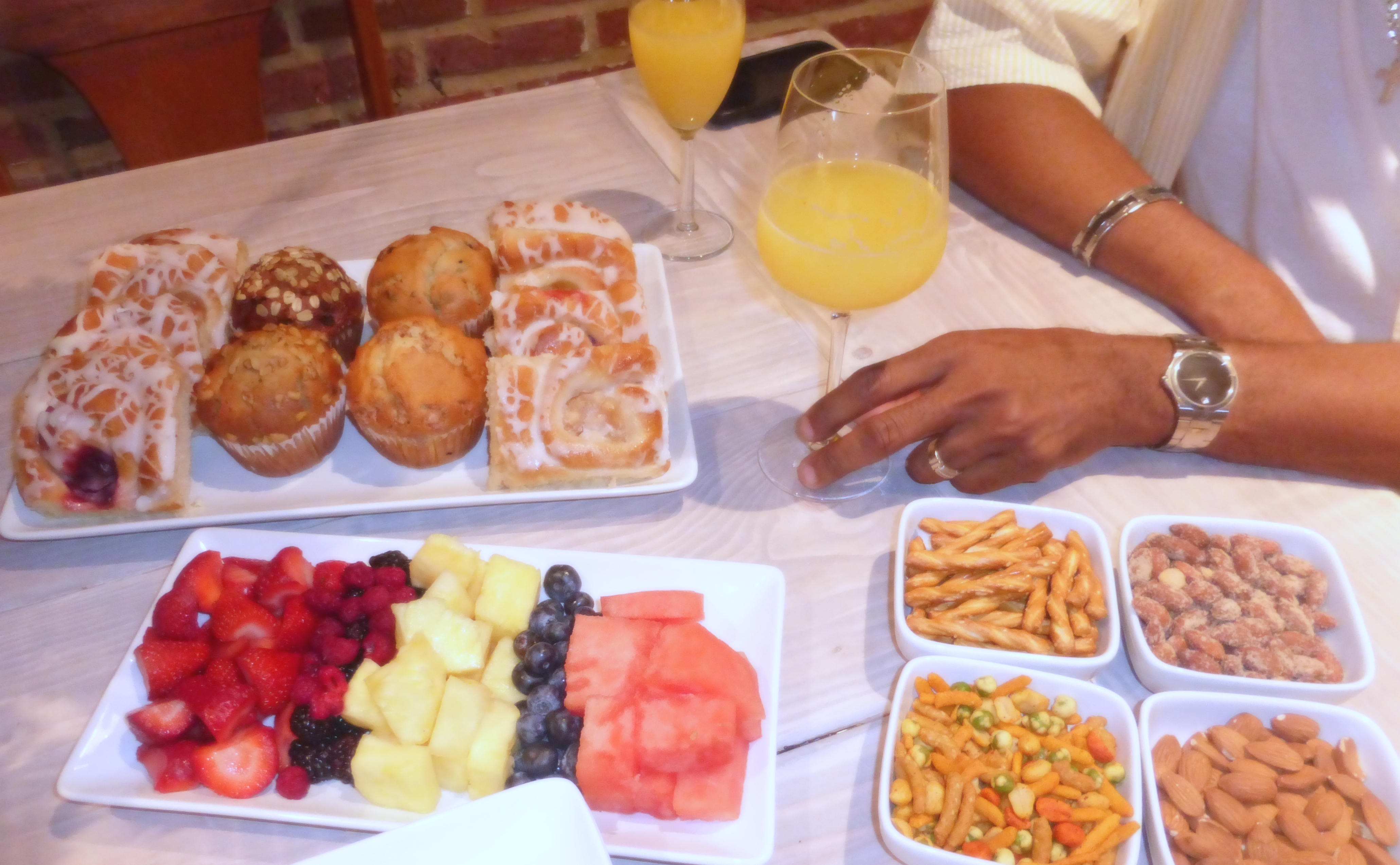 Don’t worry, I didn’t forget the sweets! Fresh pastries, muffins & fruit. Also, I put almonds, spicy chez mix, & pretzels out for our guest to nibble on before the main dishes.